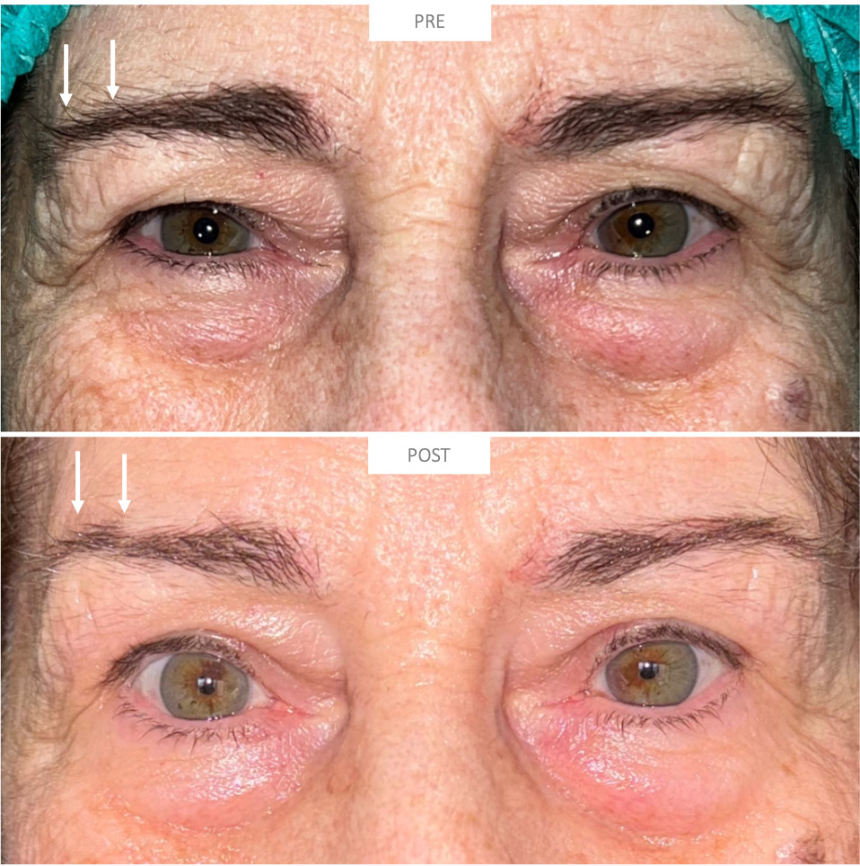 Direct brow lift, or browplasty, is the most commonly used technique to correct this. It consists of repositioning the eyebrow by means of a wedge-shaped resection, with the scar hidden in the edge of the eyebrow hair. There are also other options such as indirect lifting, internal pexy during an upper blepharoplasty or temporary lifting with botox.