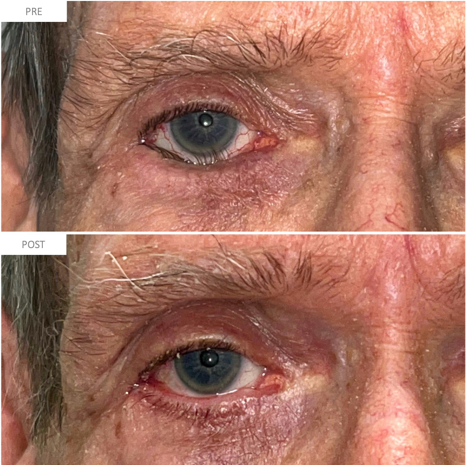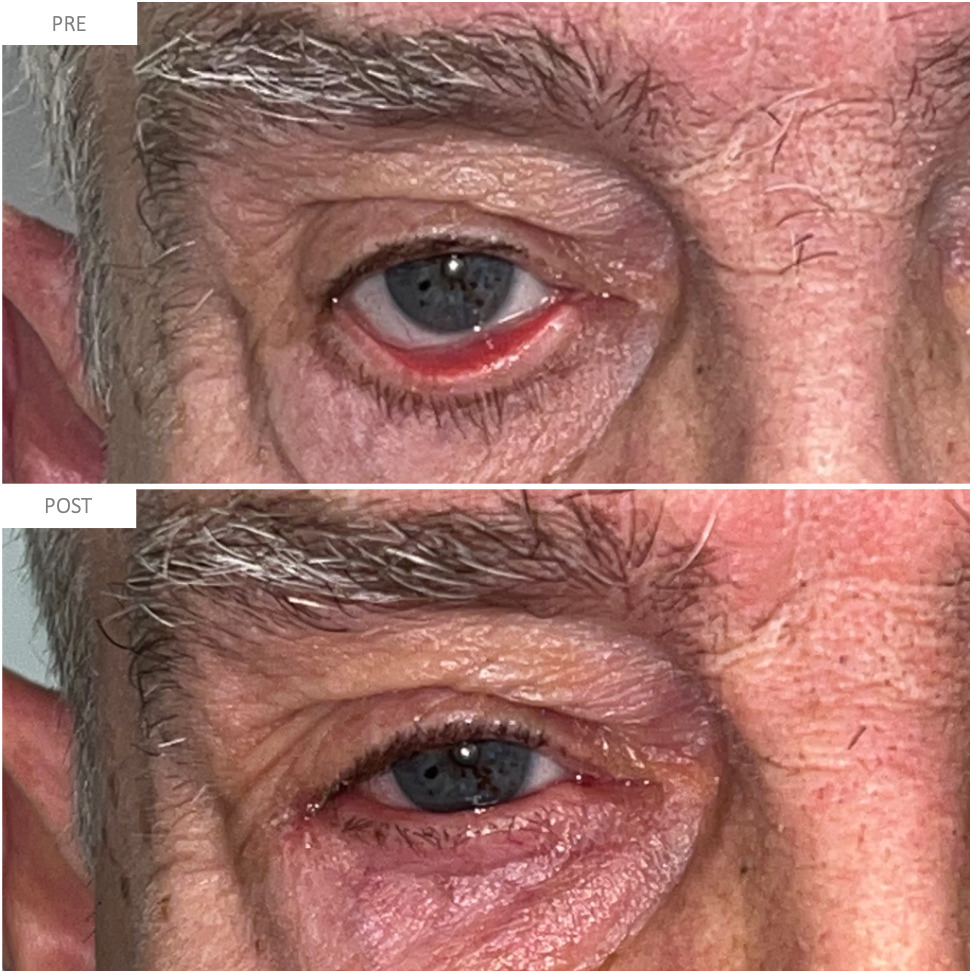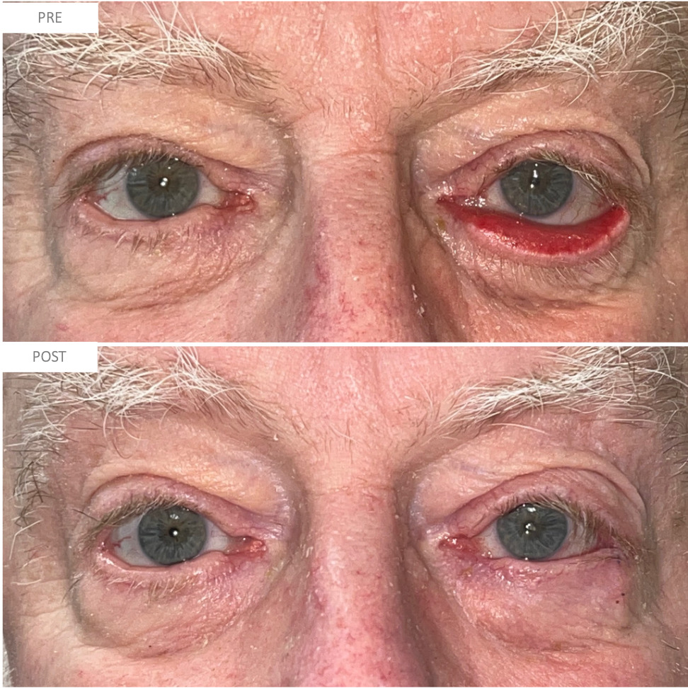 Ectropion is a condition in which the lower eyelid is turned outwards, which can lead to discomfort, irritation, constant tearing and an increased risk of infection or eye damage due to increased exposure of the eye. It can also represent a significant cosmetic impairment.